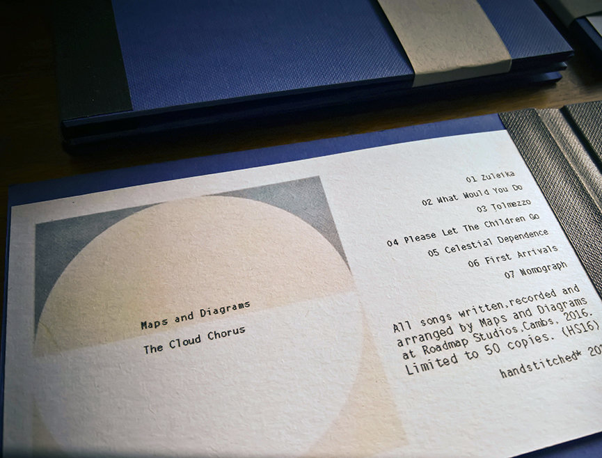 "The Cloud Chorus" is a limited edition mini CD-r issue of 50 copies, bound in hand-made sleeves, music by Maps and Diagrams, packaging and artwork designed, bound and packed at Roadmap Studios, Cambs, UK. Inserts printed on a lightweight merino wool paper.